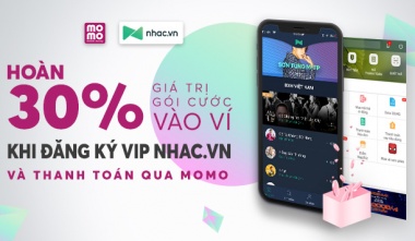 Nhận hoàn tiền tiết kiệm lên đến 30% giá trị gói cước vào ví Momo cho khách hàng khi đăng ký dịch vụ VIP trên Nhac.vn và giao dịch qua ví Momo.